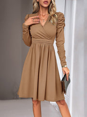 Ladies Fashion Elegant Solid Color V-neck Long Sleeve Dress
