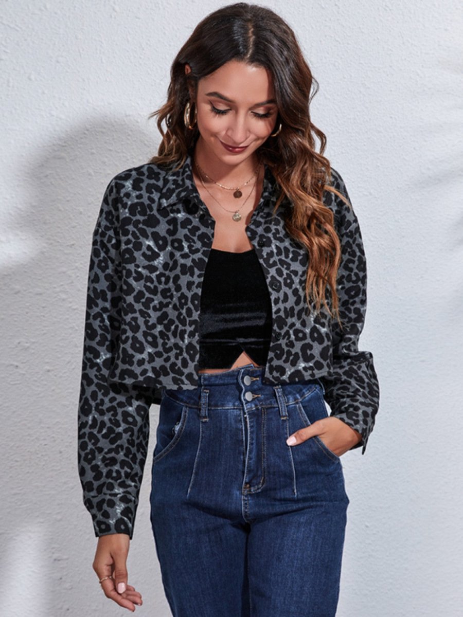 Leopard Button Up Collared Neck Cropped Jacket - Black / S