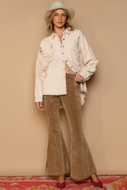 POL Button Down Raw Hem Distressed Shacket - Pink Beige / M