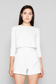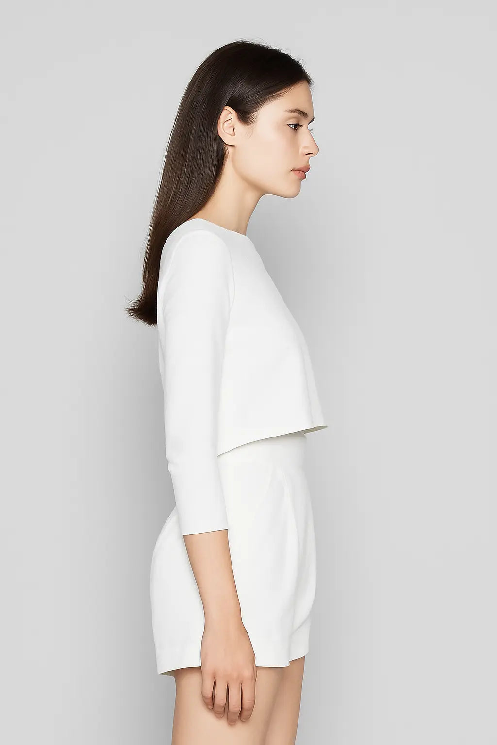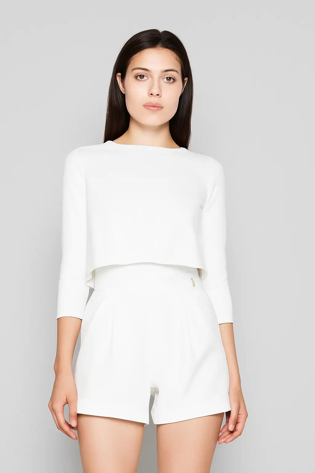 Elegant two-layer jumpsuit with short strapless shorts. The top with long sleeves, worn from the front, at the back fastened with a hook and eye fastener. The model with an original cut.