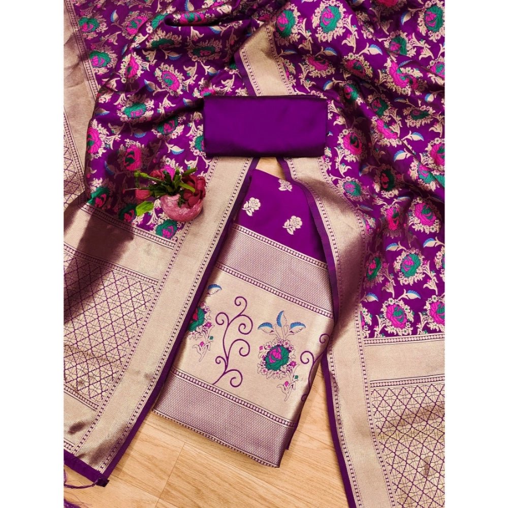 Generic Women's Banarasi Silk Printed Unstitched Salwar Suit Material With Dupatta (Purple, 3Mtrs) - Purple / Banarasi silk / Unstitched Salwar Material With Dupatta