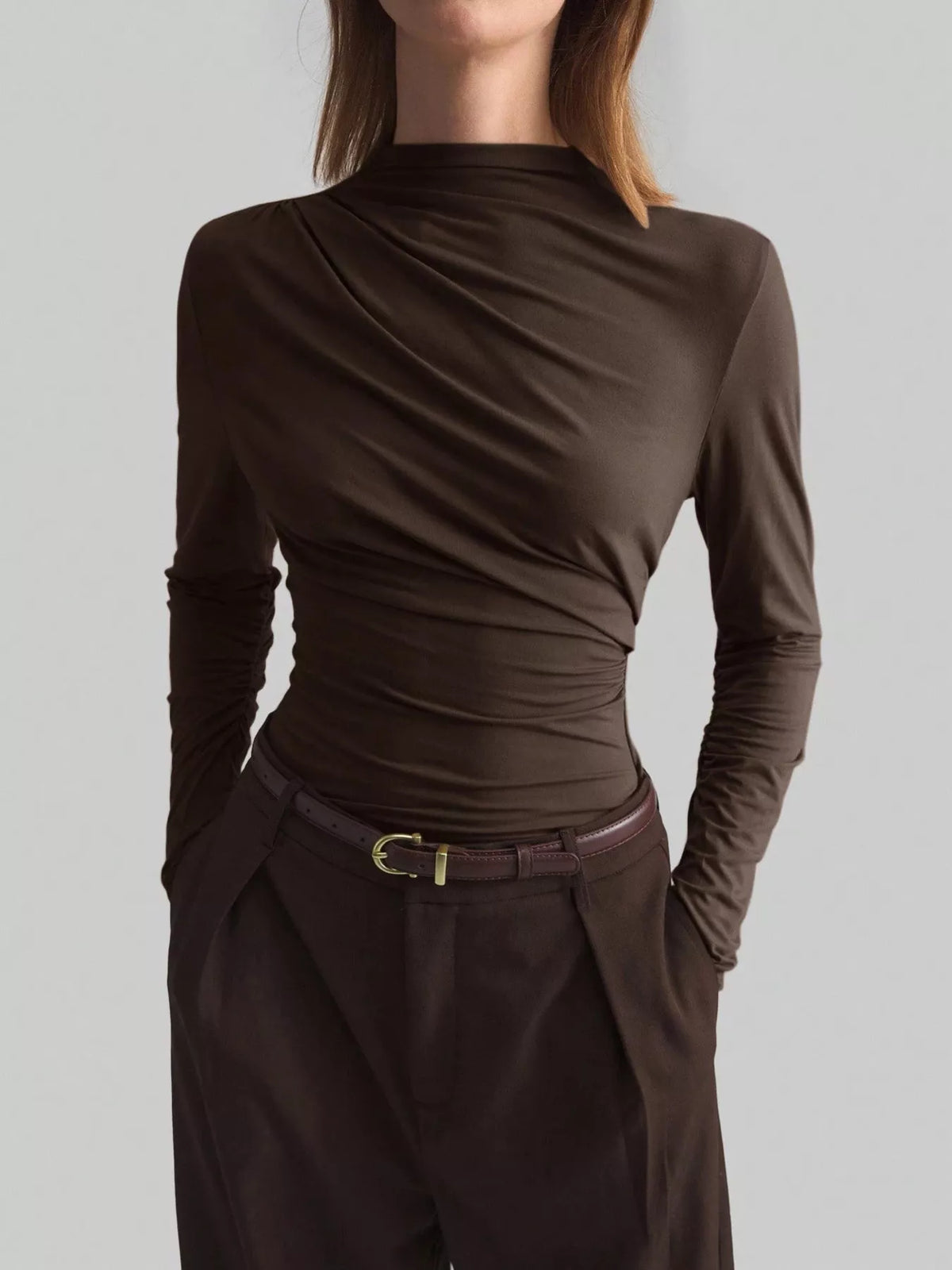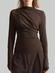 Elegant Drape Front Long Sleeve T-Shirt - Chocolate / S